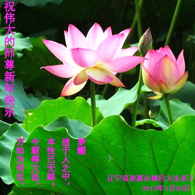 【明慧网二零一三年二月七日】 辽宁省朝阳市大法弟子一家恭祝师尊过年好!