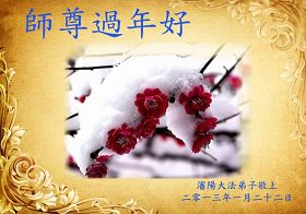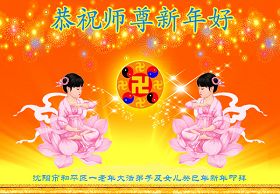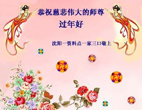 转眼间要过大年了,我们全家人给尊敬的恩师拜年了:师父过年好!弟子一定时刻以法为师,百分之百的信师信法,遇事向内找,修好自己更好的完成救度众生的神圣使命。念师父,盼望师父早日回大陆。深深叩拜恩师苦度救命之恩! 辽宁省沈阳大法弟子恭祝慈悲伟大的师尊过年好!