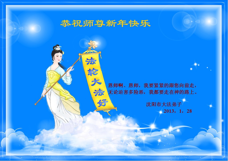 我们沈阳一学法小组大法弟子: 恭祝师尊癸巳年新年快乐!在修炼的道路上,无时无刻的感受到师尊的呵护和期望,在剩下的时间里,我们要更加清醒理智的修好自己,慈悲救度世人,兑现自己史前的誓约。 二零一三年一月二十三日 辽宁省沈阳市和平区一老年大法弟子及女儿恭祝师尊新年好!