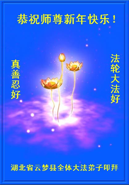 尊敬的师父:弟子给您拜年!我非常想念师父!在新的一年里,在法正人间的最后时间里,我更要按宇宙大法“真、善、忍”的标准严格要求自己,处处向内找,提高心性,努力去做三件事,做好三件事,跳出常人中的壳,跟师父回家。 湖北省孝感市云梦县全体大法弟子恭祝慈悲伟大的师尊新年快乐!