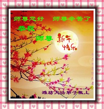祝师尊新年愉快! 弟子这些年跟随师父正法也越来越成熟了,请师父放心,弟子一定把三件事情做好,愿师父今后多一些欣慰,少一些操心。弟子想念您!! 山东潍坊大法弟子 山东省潍坊市寒亭区全体大法弟子给慈悲伟大的师尊拜年!