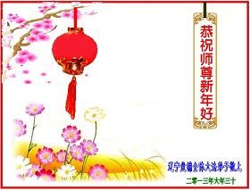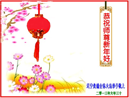 每逢佳节倍思亲,在新年到来之际,我们万分想念恩师,恩师为我们付出的太多太多无以言表,而我们深感愧对恩师。唯有多学法,做好三件事,多救人,紧跟正法進程,做恩师的真修弟子,让恩师多一份欣慰,少一份操劳。 辽宁盘锦西三场全体大法弟子叩拜恩师 二零一三年一月二十五日 辽宁盘锦大法弟子给慈悲伟大师父拜年:师父新年好!