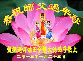 在新的一年里,弟子们一定修好自己,做好三件事,跟师父回家,请师父放心。 辽宁盘锦三名大法弟子 2013年1月31日 辽宁盘锦市大法弟子恭贺师父过年好!