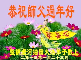 大年到了,想念师尊。恭祝师尊过年好!师尊辛苦了!弟子唯有精進再精進,以报师恩,叩拜伟大的师尊。 2013年2月3日 辽宁省盘锦市大法弟子向慈悲伟大的师父拜年!师父过年好!