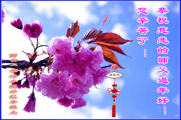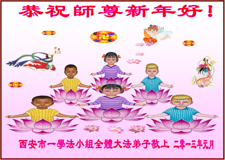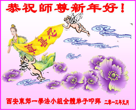 感谢伟大慈悲的师尊辛劳救度! 弟子们想念您!弟子们一定做好师父交给的三件事! 祝贺师父新年愉快!主佛慈悲无量。 西安阎良大法弟子敬贺 二零一三年腊月初二 陕西省西安一小花弟子们恭祝师尊新年快乐!