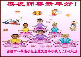 师尊您好!我们要修好自己,学法修心、做好三件事,配合好整体,让师尊您少一分操劳,多一份欣慰!坚修大法随师还。 陕西西安市一学法小组全体大法弟子恭祝师父新年好!