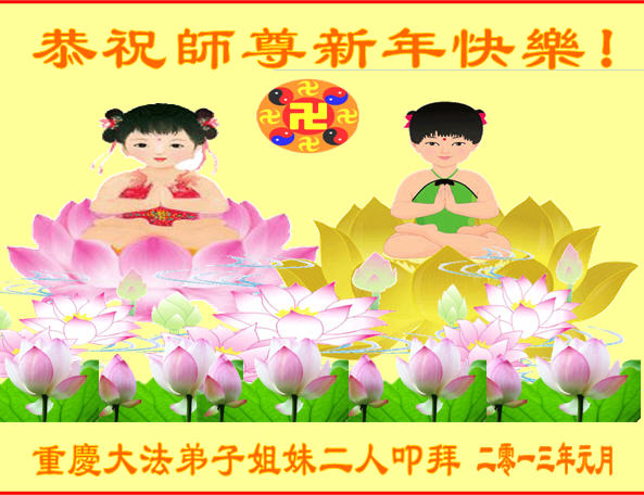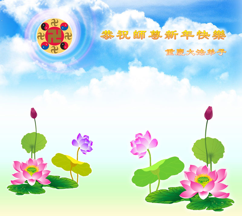 师父您好!您辛苦了!为了众生、为了救度所有的生命,耗尽了您一生的心血。弟子在此万分感谢!弟子唯有精進、再精進,尽快修去一切不符合大法的言行,做好三件事来报答师恩。 重庆大法弟子全家人向慈悲伟大的师尊叩拜祝师尊新年快乐!