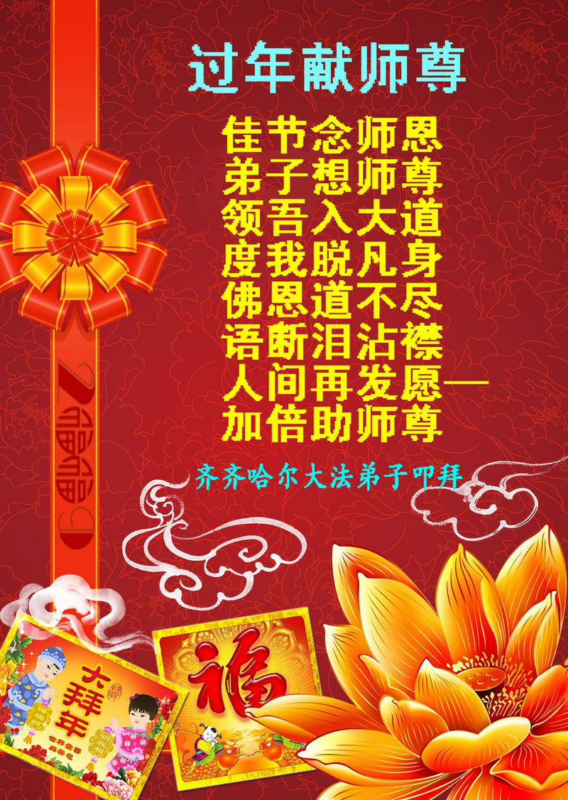 过年献师尊 佳节念师恩 弟子想师尊 领吾入大道 度我脱凡身 佛恩道不尽 语断泪沾襟 人间再发愿—— 加倍助师尊 黑龙江省齐齐哈尔市碾子山区全体大法弟子恭祝慈悲伟大的师尊过年好!