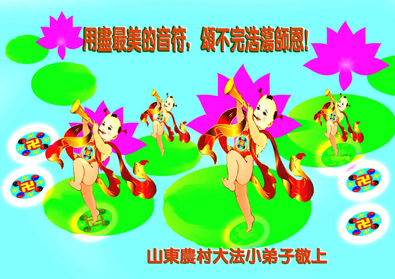 弟子想念慈悲伟大的师尊!感谢师尊的慈悲救度!弟子听师尊的话,每天学法炼功,向世人讲真相,在心性的提高上弟子从不打折扣,严格按照大法标准要求自己,生怕做的有不符合大法的地方让师尊再操心,因为师尊为救度众生已经吃了无数无数的苦,弟子只求修炼好自己,不能辜负师尊的慈悲苦度,作为弟子唯有让师尊欣慰的份儿,没有任何理由再额外的让师尊操心。 弟子跪拜师尊!感恩师尊! 山东省烟台栖霞农村父女二人学法小组恭祝慈悲伟大的师父生日快乐!普天同庆世界法轮大法日!