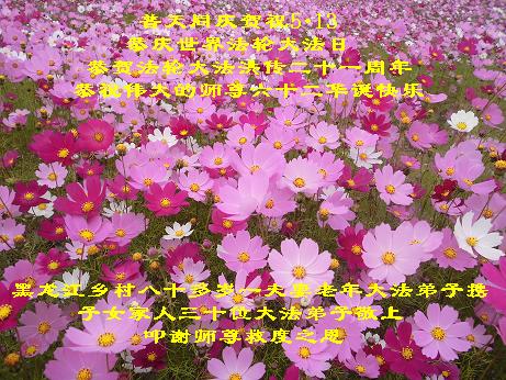 大法洪传二十一周年了,师父为弟子及众生付出了多少心血,未来宇宙中的生命会记得师父的慈悲和威德。师父您辛苦了!弟子会尽力做好三件事,不负史前大愿,盼随师回家园。 山东省烟台栖霞农村全体大法弟子恭祝5.13世界法轮大法日!恭祝伟大的师父生日快乐!