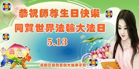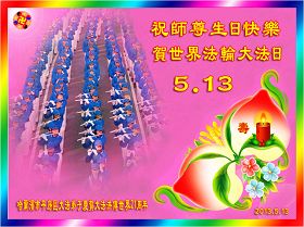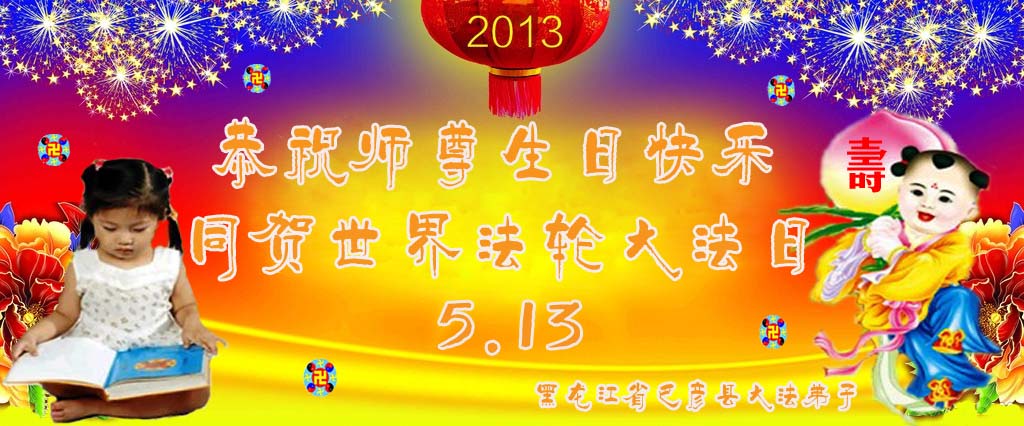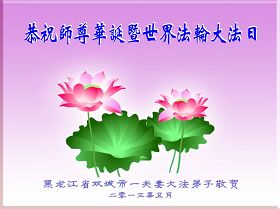 【明慧网二零一三年五月十日】 黑龙江省哈尔滨市平房区大法弟子恭祝师尊生日快乐!庆贺大法洪传世界二十一周年!