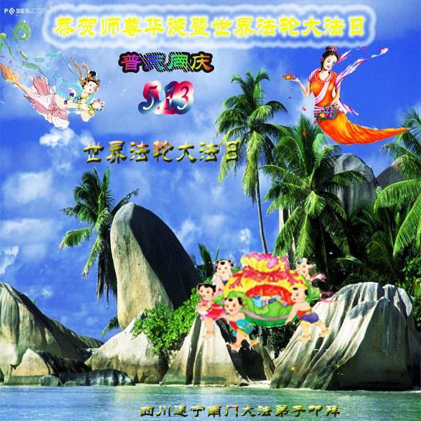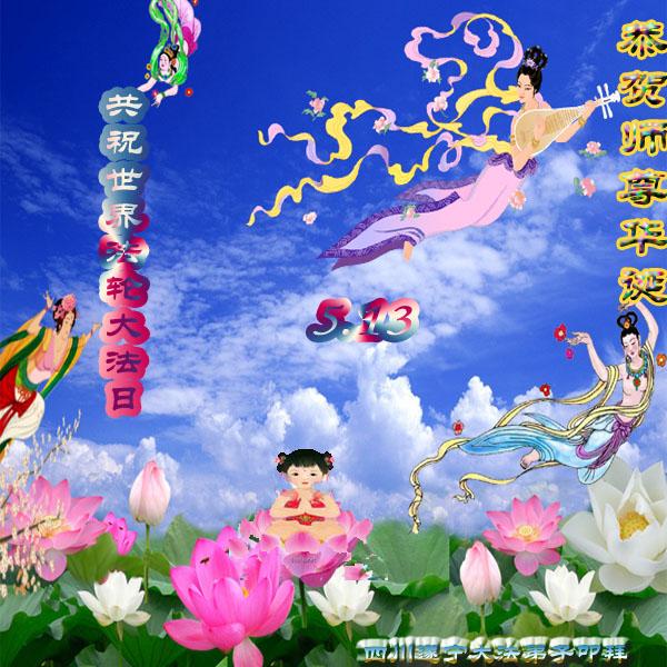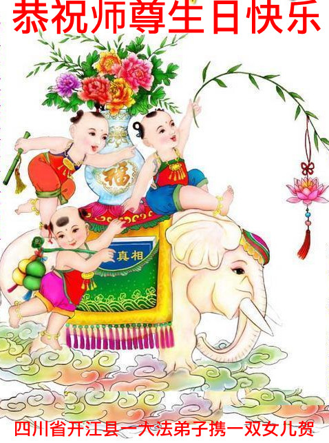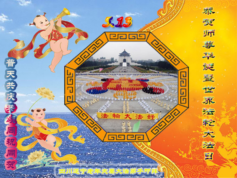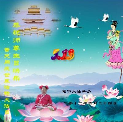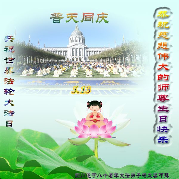 | 【明慧网二零一三年五月十日】 四川遂宁大法弟子新新、子莲、英莲叩拜师尊生日快乐! 四川遂宁老年大法弟子恭贺师尊华诞暨世界法轮大法日!