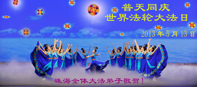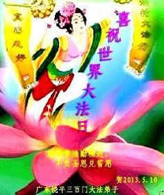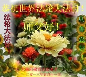 又喜迎来世界法轮大法日!正法十四载,经历风和雨,使我们更加成熟,更加坚定不移证实法,坚定不移做好三件事,更加坚定大法弟子金刚志,更加坚定大慈大忍修心性,无悔无恨救世人! 广东揭阳大法弟子 二零一三年五月十一日 广东省梅州市全体大法弟子恭贺世界法轮大法日暨法轮大法洪传二十一周年!
