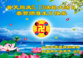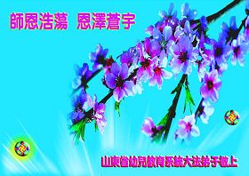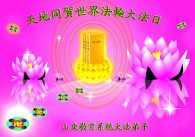 师父您好!我们虽然与师父远隔重洋,但是我们感到师父就在我们身边,时时的看护着我们,点悟着我们,只要我们坚信师父,坚信大法,大法的神奇和美妙就会展现给弟子,就能够逢凶化吉,遇难呈祥。师尊的佛恩浩荡,弟子用尽人类的任何语言都无法表达!弟子唯有严格要求自己,继续精進实修,多救众生,才能兑现誓约圆满的跟师父回家! 跪拜师尊!合十! 山东教育系统大法弟子恭祝师尊生日快乐!恭贺世界法轮大法日!