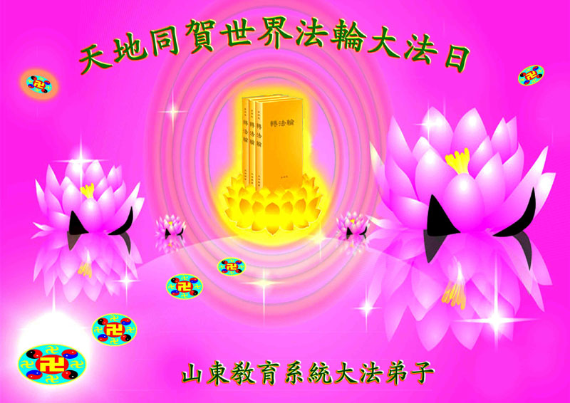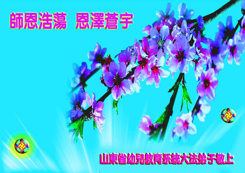 感恩师尊救度弟子!弟子先天的本愿是跟随师尊下世,在人世间助师正法救度众生,弟子为自己的使命深感荣幸!弟子沐浴着佛恩浩荡走到今天,深知自己的责任重大,在宇宙正法时期,每一秒都珍贵如金,因为此刻的每一秒都是师尊用巨大的承受延续而来,为的是慈悲于众生,因为正法一旦终止,一切都将成为永恒!唯有在真善忍大法中勇猛精進,荡尽不符合真善忍特性的一切因素,在大法中不断的升华,以一个真正的大法粒子的神的状态展现在人世间,向世人展现大法的殊胜与庄严,才能尽一个正法时期大法弟子应当尽的责任,才能履行大法徒的神圣使命,才能圆满的跟师尊回家。弟子跪拜师尊!合十! 山东省幼儿教育系统大法弟子恭贺师尊华诞暨世界法轮大法日!