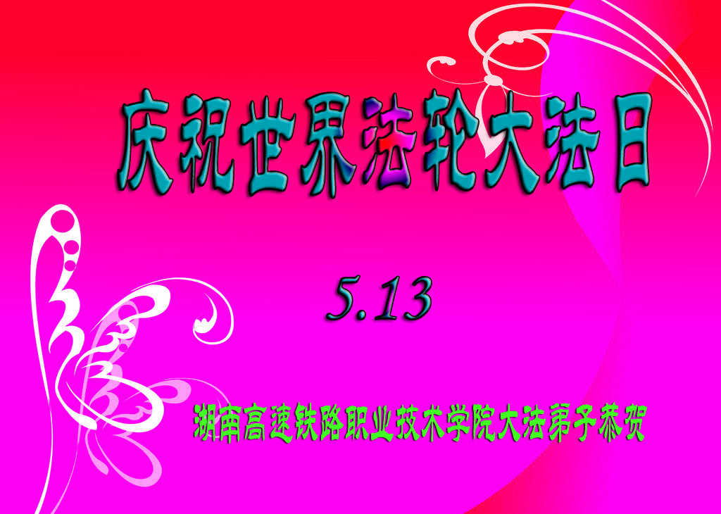 弟子感恩伟大慈悲的师尊!回首十几年的正法修炼路,弟子感慨,走过了风风雨雨,历炼了自己,一桩桩,一幕幕,一路上磕磕绊绊,点点滴滴的提高都离不开伟大师尊的慈悲呵护。正法修炼已進入尾声,弟子愧对师尊,因为弟子还有很多人心没去掉,距离大法的标准还很远,但是请师尊放心,弟子要勇猛精進,去掉一切执着心,做好三件事,圆满的跟师尊回家。跪拜师尊!合十! 湖南高速铁路职业技术学院大法弟子庆祝世界法轮大法日!恭祝师尊生日快乐!