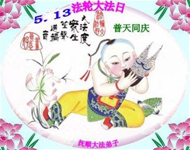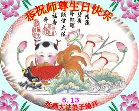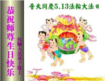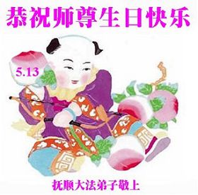 五月十三日世界法轮大法日就要到了,在这普天同庆的日子里,辽宁省鞍山市一资料点母女俩大法弟子恭祝慈悲伟大的师尊生日快乐!恭祝师尊传法二十一周年!祝全世界的同修们节日快乐!祝我们全世界的大法弟子节日添正念!真的愿更多的众生得到大法的救度! 师尊啊!您为解救宇宙中所有的众生辛苦了!您为救度我们操碎了心,在这正法即将结束的最后时刻,弟子们唯有精進实修,做好三件事,这是您对弟子们的最大期盼!弟子们一定好好修,跟您回到真正的家!再次叩谢师尊对弟子们的慈悲苦度!弟子目前还不会象其他同修那样用贺卡的方式来表达对您的思念和祝福,所以只能用文字的方式来表达我们的心情了。合十! 2013年4月22日 辽宁抚顺大法弟子庆贺世界法轮大法日!