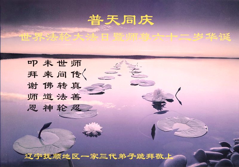 跪拜师尊六十二华诞、恩师度我登法船,至今得法十七年。学法得法修心性,救度众生史前愿。了解真相明善恶,众生得救大劫前。坚修大法紧随师,弟子愿师笑开颜。 抚顺市一大法弟子叩拜 辽宁抚顺地区一家三代大法弟子普天同庆世界法轮大法日暨师尊华诞!