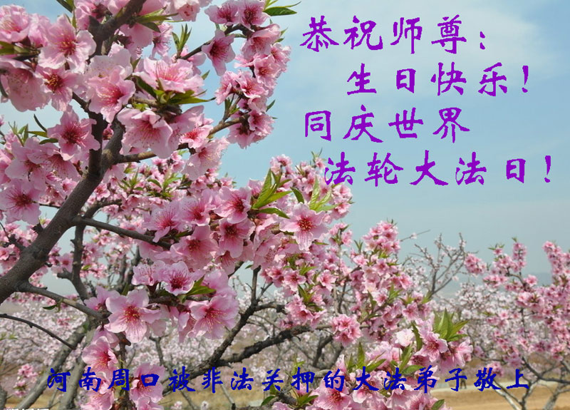 弟子永远的感恩师尊! 是师尊在弟子彷徨迷茫时引领弟子喜得高德大法;是师尊呵护着弟子一路上平稳的在大法中升华着;是师尊点悟着弟子如何在大法中修自己找自己的不足;是师尊让弟子了悟了正法修炼与宇宙中的旧势力毫无牵扯;是师尊让弟子同化宇宙大法向先天真我不断升华,去掉一切为私的旧观念,在人世间助师正法救度众生。弟子用尽人间的任何词汇都无法描述弟子对师尊的无限感恩!唯有修好自己,多救众生,才能不让师父失望! 弟子跪拜师尊!合十! 河南周口被非法关押的大法弟子恭祝师尊生日快乐!同庆世界法轮大法日!弟子想念您!