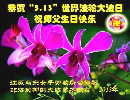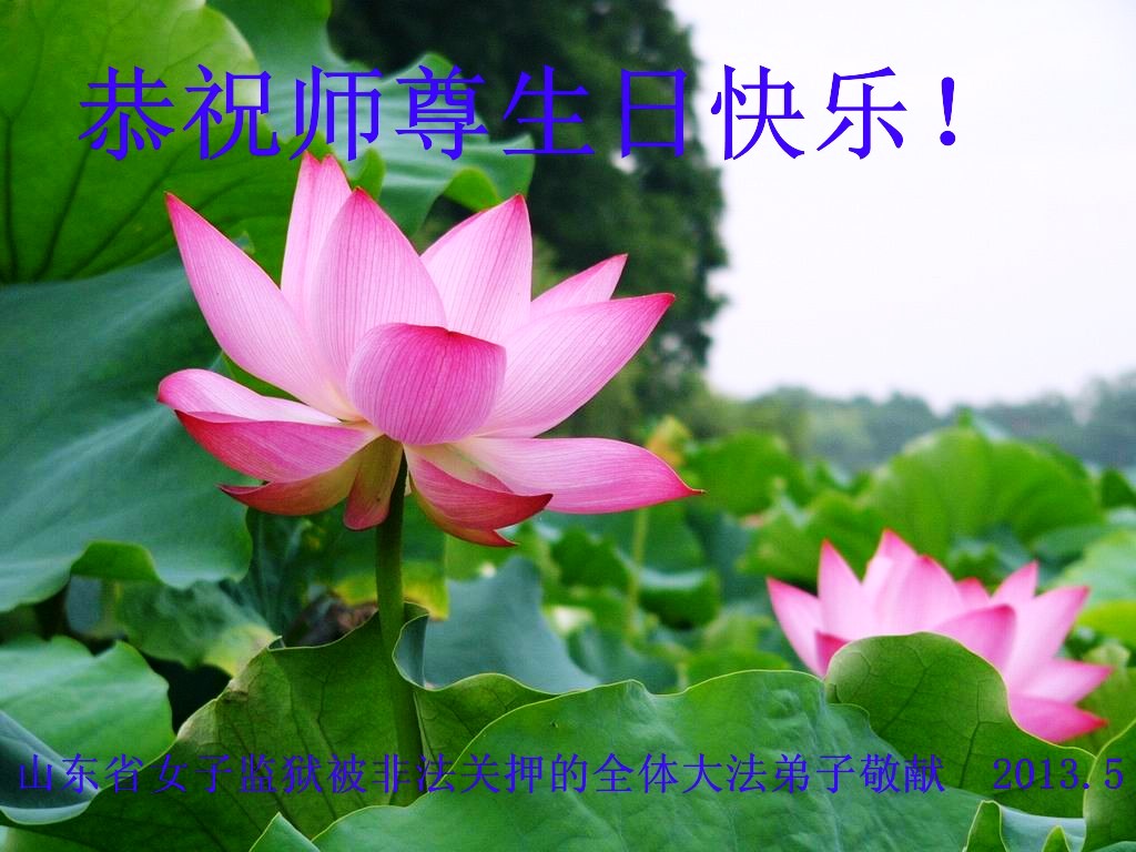 【明慧网二零一三年五月十日】 被非法关押在山东第一女子劳教所的全体大法弟子恭贺师尊华诞暨世界法轮大法日!