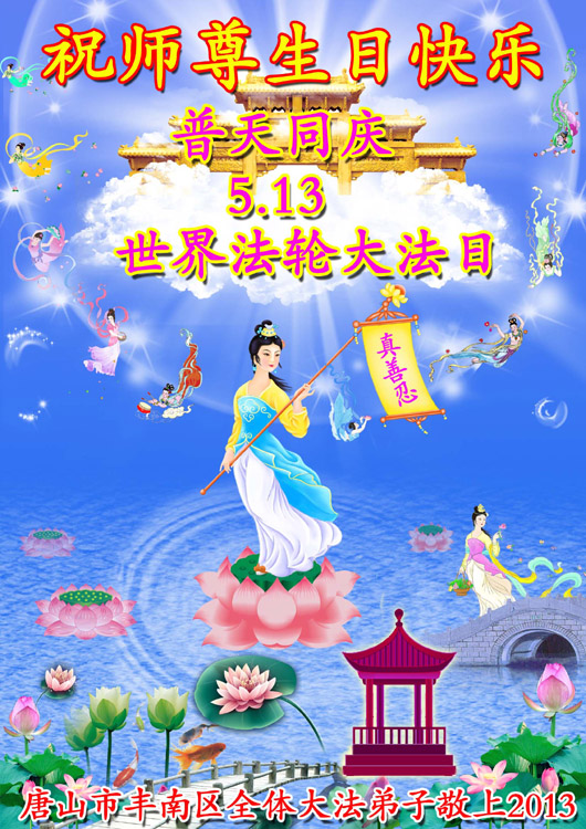 普天同庆、同颂、同祝:“五•一三世界法轮大法日暨师父华诞”!法轮大法洪传全世界二十一年! 师父您辛苦了!谢谢师父的慈悲救度!弟子深感师恩浩荡! 请师父放心,我们一定走好以后师父安排的修炼路,遇事向内找,整体配合,跟上师父的正法進程,兑现誓约。 丰润区全体大法弟子敬上 二零一三年五月六日 河北省唐山市丰润区青年大法弟子庆贺五•一三世界法轮大法日!