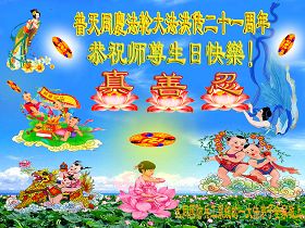 师父您好! 师父辛苦了! 弟子恭祝师父生日快乐! 佛恩浩荡贯洪微, 救度苍生遍寰宇。 普天同庆大法日, 千秋万代颂师恩。 二零一三年五月三日