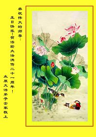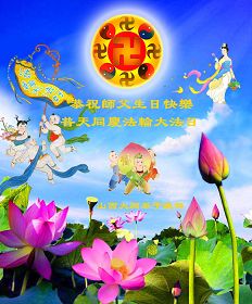 祝慈悲伟大的师尊生日快乐!师尊您辛苦了!想到师尊一再操劳,弟子感慨万分。盼望师尊早日回归故土。 颂师恩 上明慧清心迷茫解 师尊静坐慈悲威严 盼众生得救师所愿 弟子感恩泪水涟涟 千年轮回迷茫走险 恩师担当消除磨难 万幸得度生命永远 助师正法誓约兑现 浩瀚苍穹正邪大战 正念除恶乾坤再造 感慨万分登上法船 众生得救大法颂传 法徒助师光彩万千 感慨万分盼师早归 完成使命真相大显 山西省朔州市怀仁县全体大法弟子在法轮大法洪传二十一周年之际、向慈悲伟大的师父问好!叩首!再叩首!感谢恩师多年来对弟子的呵护与操劳。 赞佛恩 二十一载呕心沥血 神威超穹正法灭邪 承受担当艰辛不歇 慈悲救度众生迷解 恩师操劳铺垫一切 邪灵歪理画皮已揭 众生在醒真相在接 万物更新平息大劫 众生得救定把恩谢 山西大同全体大法弟子祝师父生日快乐!