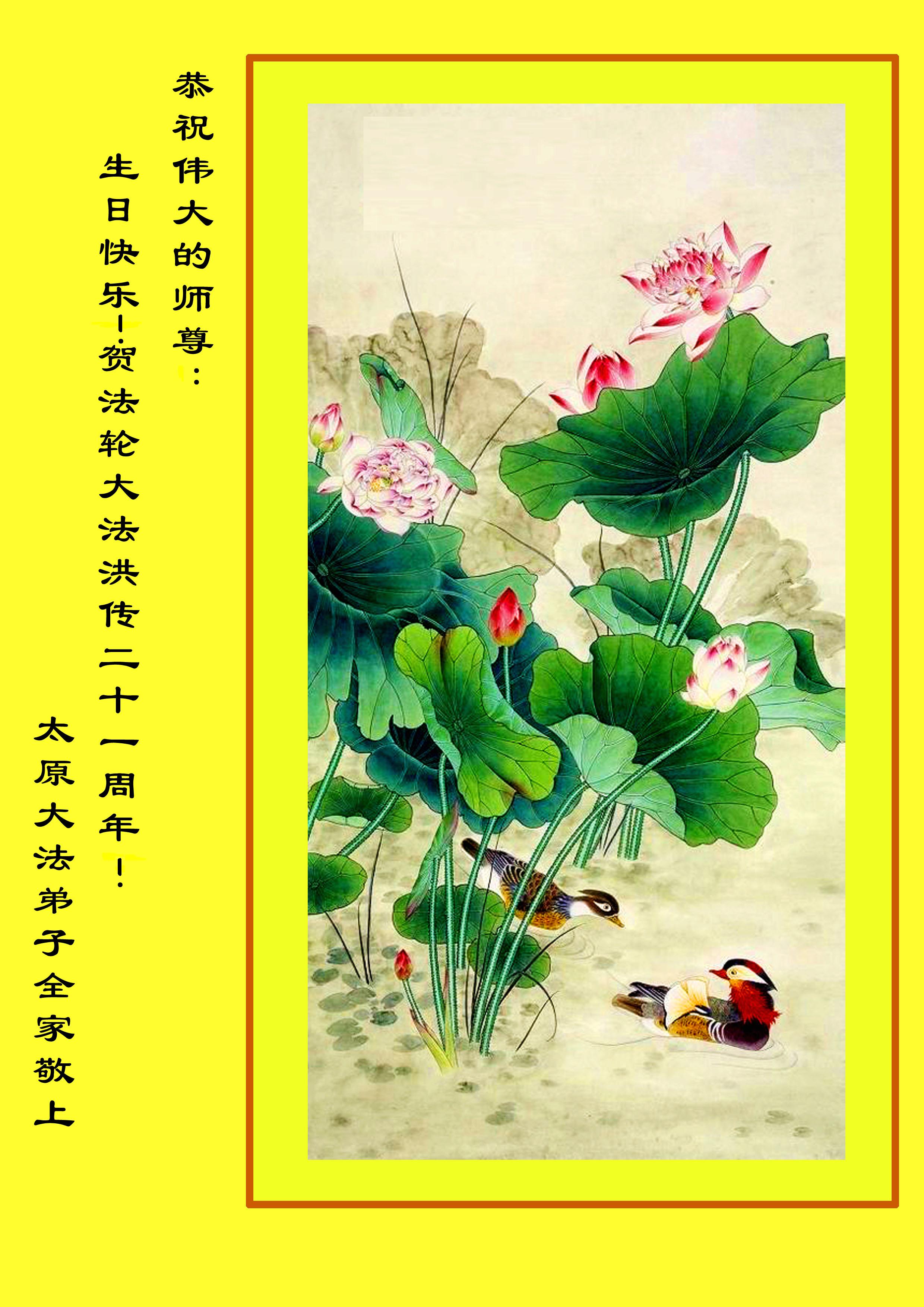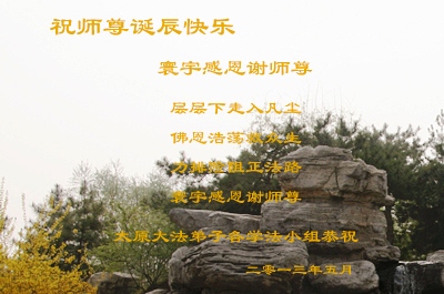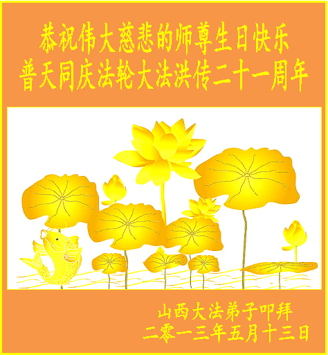 慈悲伟大的师父,我们大陆大法弟子,值此师尊华诞和世界法轮大法日来临之际,我们以感恩的心情,恭祝师尊华诞,祝贺法轮大法弘传世界二十一周年,庆祝世界法轮大法日。 在513这个普天同庆的日子里,师父,弟子们想您,弟子一定做好三件事,听师父的话,向内找,修好自己,走好最后的路! 太原大法弟子敬上 山西运城大法弟子祝师父生日快乐!