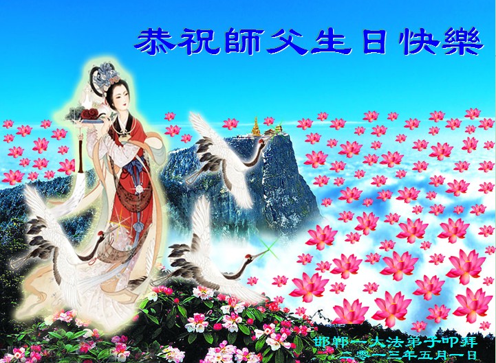 恭贺法轮大法洪传世界一百多个国家和地区!讲真相救众生,兑现誓约,随师还。 邯郸一学法小组全体弟子敬贺 2013.5.3 河北省邯郸一大法弟子叩拜师恩,恭祝师父生日快乐!