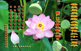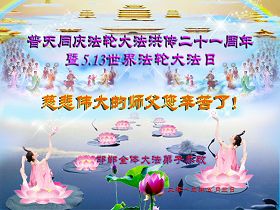 每年的5月13日是“世界法轮大法日”,也是伟大师尊的华诞。在此普天同祝的时刻,感谢师尊的救度之恩,我们一定要勇猛精進,做好三件事,不负历史赋予我们的使命,跟随最慈悲伟大的师父把家还! 遥拜! 合十! 河北邢台市大法弟子 二零一三年五月三日 河北衡水全体大法弟子恭祝师父生日快乐!