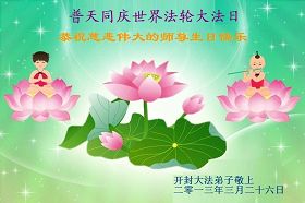 师父您好,您辛苦了! 我代表河南焦作全体大法弟子向您问好,祝师父生日快乐。普天同庆世界法轮大法日。我们一定听师父的话,精進修炼,救度众生,并认真做好大法弟子应该做的三件事,以兑现为法而来的誓约。 河南省焦作市全体大法弟子合十敬上 二零一三年五月三日