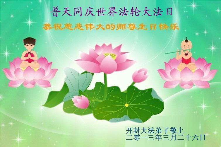 慈悲伟大的师尊: 您好!弟子们想念您,盼望能早日见到师尊!感恩师尊的苦度!师尊您辛苦了!我们通过世人对我们的态度,真切的感受到了师尊正法的洪势,弟子们更加坚信:我们是最正的!没有人能阻挡我们回归的脚步!我们一定会像《永恒的故事》结尾中那样:我们一定会光荣的回去!我们深感时间的紧迫与救人的责任重大,请师尊放心,我们一定抓紧时间修好自己,无私无我的救人--人心更少一些,更加纯净、效率更高、面积更大、更加深入的做好救人事情,不负众生的期望,无愧于“正法时期大法弟子”的第一称号!摧枯拉朽、荡气回肠!能助师正法,我们是何等的幸运!我们决不后悔当初的选择,我们一定会对自己、对众生负责任的!请师尊放心! 河南省开封大法弟子恭祝师尊生日快乐!