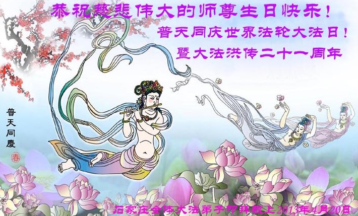 石家庄全体大法弟子恭贺5.13世界法轮大法日!恭贺法轮大法洪传世界21 周年! 恭祝慈悲伟大的师尊生日快乐!弟子们决心多学法,实修自己向内找;讲清真相多救人。弟子们感恩师尊! 叩拜师尊!合十! 河北省石家庄市桥东区大法弟子恭贺5.13世界法轮大法日!