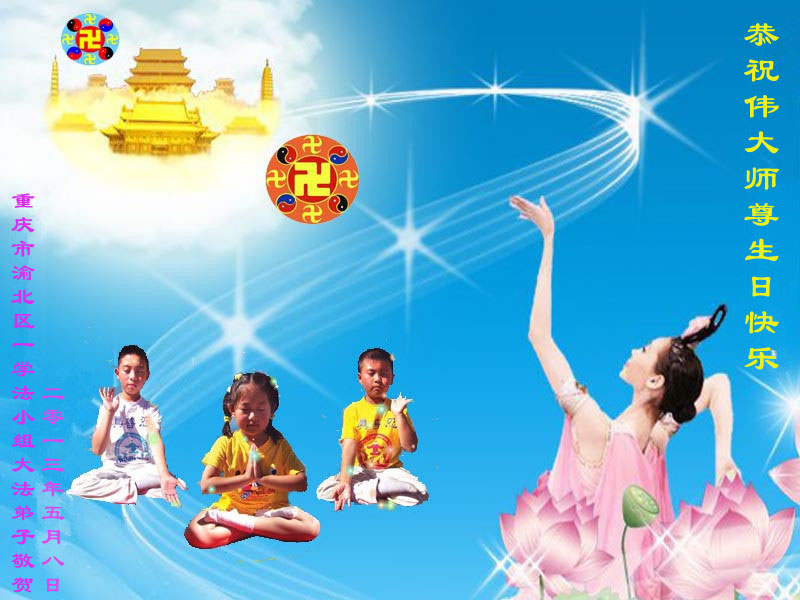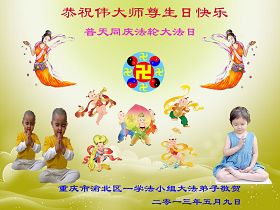 十几年的风风雨雨我们跟随师父一步步走到今天,谢谢师父的慈悲救度。佛恩浩荡,用尽千言万语无法表达对师父的感恩。唯有走好最后的每一步,修好自己,救度更多众生,让师父多一点欣慰少一点操劳。随师返家园。 重庆渝中区大法弟子 二零一三年五月四日 重庆市沙坪坝区大法弟子恭祝伟大师尊生日快乐!