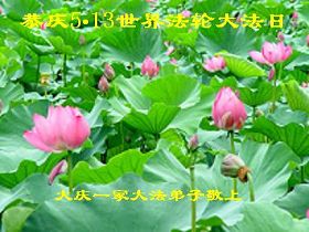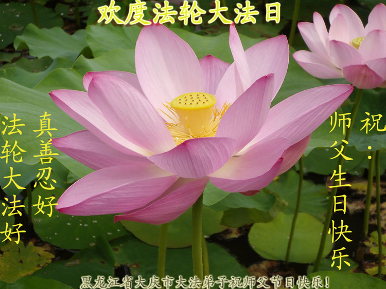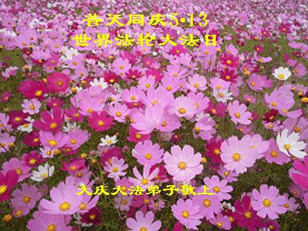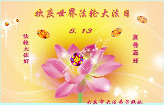 在这普天同庆的盛大的感恩日子里,我们每个大法弟子都有一颗无限感恩的心,无限感恩师尊在人类面临危险的时候,将宇宙的根本大法——法轮佛法洪传于世,给人类一次最后选择得救的机会。无限感恩大法赐予我们的无边恩惠!无限感恩师尊赐予我们无限美好的未来!二十年来,师尊为了弟子们能够圆满回归,为了更多的众生能够得救,承受与付出的是无法想象的巨大……。为此:我们每个大法弟子要抓紧这最后剩下的不多的时间,救度更多的众生,兑现我们史前的誓约,真正配得上正法时期大法弟子的伟大称号!真正配得上是慈悲伟大师尊的弟子! 黑龙江省大庆一家大法弟子普天同庆世界法轮大法日暨法轮大法洪传二十一周年!恭祝慈悲伟大的师尊华诞快乐!