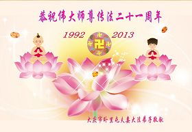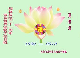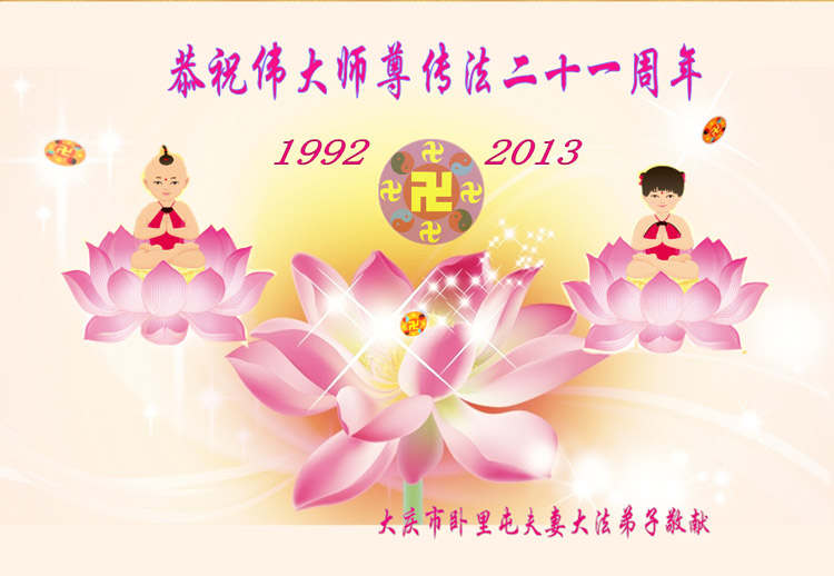 普天同庆世界法轮大法日!庆祝师尊洪传法轮大法二十一周年! 中国大陆大庆大法弟子敬上 二零一三年四月二十七日
