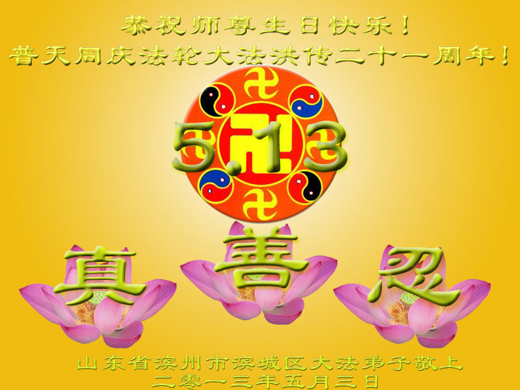 山东省滨州市滨城区大法弟子恭祝师尊生日快乐!普天同庆大法洪传二十一周年!恭祝世界法轮大法日!