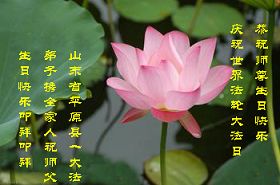 山东省招远市一母女同修及相信大法好的家人恭祝师父生日快乐!我们很想念师父也很坚信师父!我们一定走好师父安排的道路!谢谢师父! 山东威海荣成石岛两个学法小组的全体大法弟子恭贺师尊华诞!