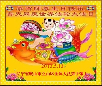 恭祝师尊华诞暨世界法轮大法日! 洪传大法度众生,转动法轮正乾坤。主佛恩泽润寰瀛,万物更生万象新。四川遂宁莲花学法小组大法弟子 二零一三年五月五日 辽宁一小镇全体大法弟子祝师尊生日快乐!