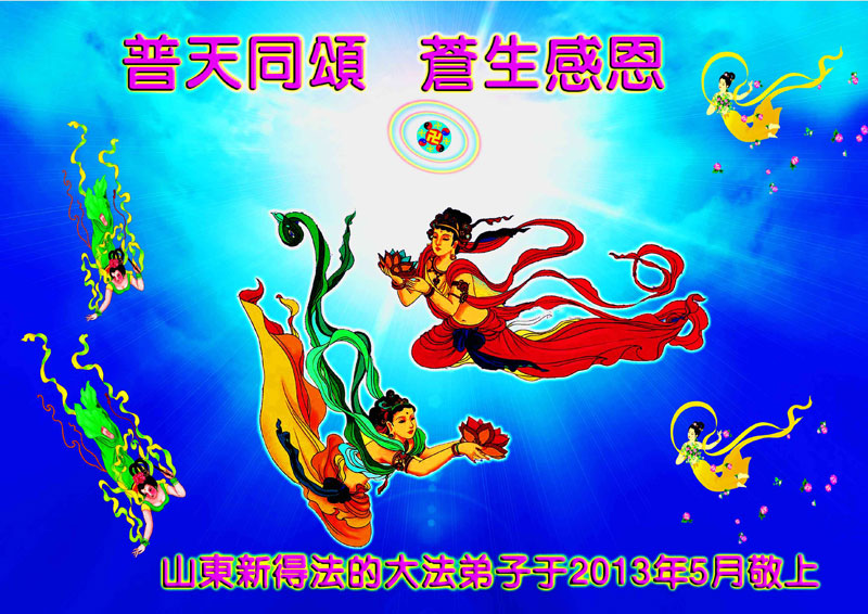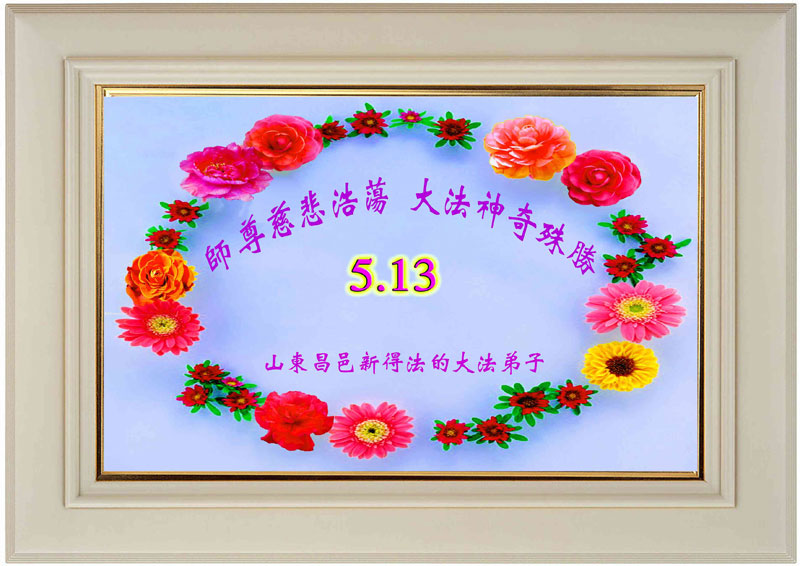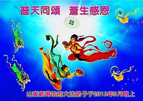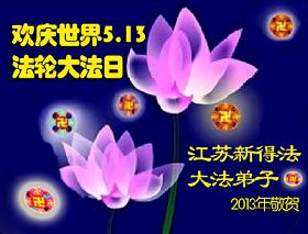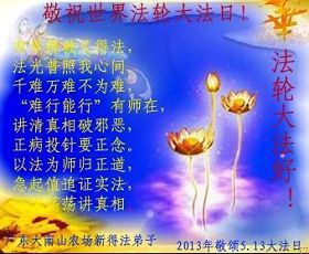 尊师:您好!我的生日和师父的生日是同一天,我感到很高兴,这也是缘份。我一定在有生之年努力学法,刻苦炼功,提高心性,早日功成圆满! 大陆大法新学员贺五月十三日法轮大法日!