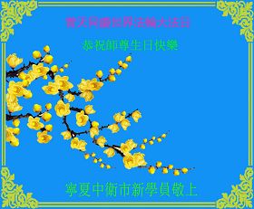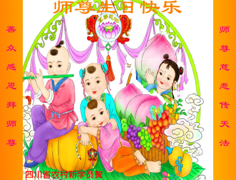 在师父巨大付出下,又迎来了师父的生日,当前正法洪势向人间迅速推進,我们当地有新学员得法,我们要做好三件事,多学法,多救人,祝慈悲、伟大的师父生日快乐! 湖北省武汉一位刚得法不久的新学员恭祝师父生日快乐!庆祝世界法轮大法日!