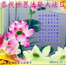 【明慧网二零一三年五月十一日】 甘肃省兰州新得法的大法弟子恭祝师尊生日快乐!恭贺世界法轮大法日!