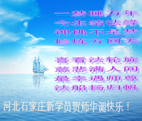 一梦睡万年 今生结法缘 神佛不是梦 修炼方回天 喜看法轮旋 慈悲满人间 最幸遇师尊 法船扬归帆 大陆法轮功新学员贺世界法轮大法日!
