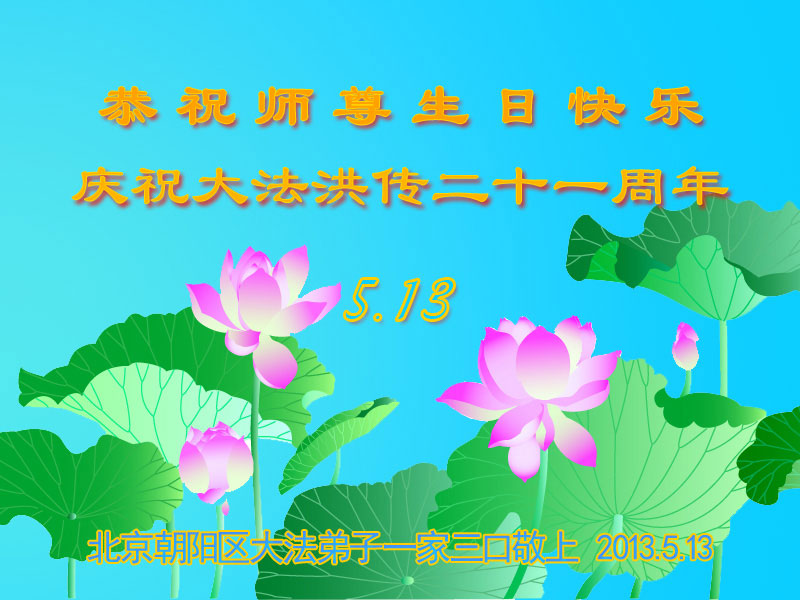 【明慧网二零一三年五月十一日】 北京朝阳区大法弟子一家三口恭祝师尊生日快乐!庆祝大法洪传二十一周年!