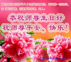 恭祝师尊生日快乐!叩谢师尊把我们从地狱中捞起、洗净,成为一个大法徒,未来的神,佛恩浩荡,岂能语言诉尽!倾天河之水写不尽师尊的救度之恩! 值此师尊“5.13”诞辰来临之际,弟子唯有精進再精進,学好大法紧随师,多救人、快救人,以报洪大圣恩! 北京东郊一老年弟子学法小组 二零一三年五月六日 身在北京的一湖北大法弟子恭祝师父生日快乐!恭贺法轮大法洪传世界二十一周年!