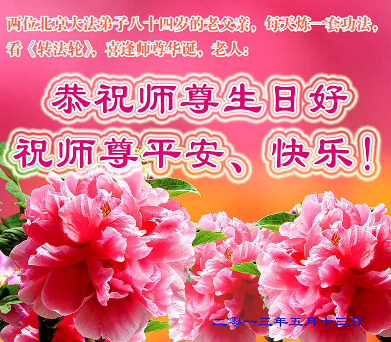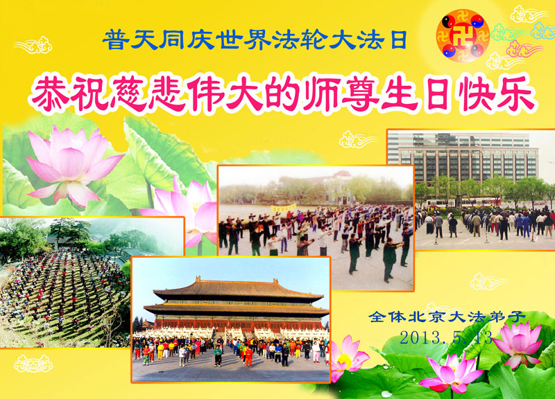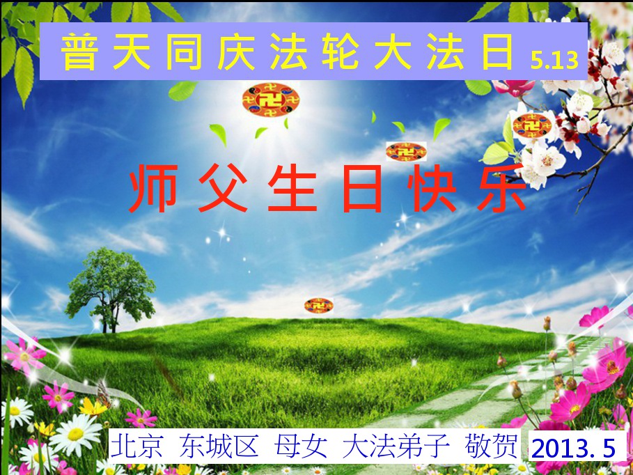 在5.13世界法轮大法日到来之际,恭祝师父生日快乐! 北京市丰台区大法弟子 2013年5月7日 北京大法弟子恭祝我们伟大的师尊生日快乐!