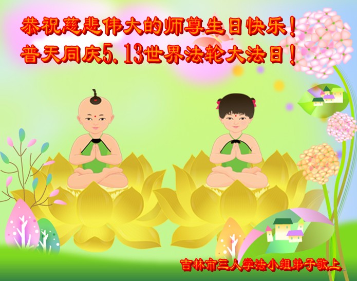 慈悲伟大的师尊您好!您辛苦了!弟子们想念您!决心净心学法,多学法,学好法,用法指导自己的一言一行,尽快提高,尽快成熟起来,真正做到让师尊多一分欣慰,少一分操劳。做好三件事,完成自己的使命。期盼着早日与师尊团聚! 吉林市三人学法小组弟子恭祝慈悲伟大的师尊生日快乐!普天同庆世界法轮大法日!