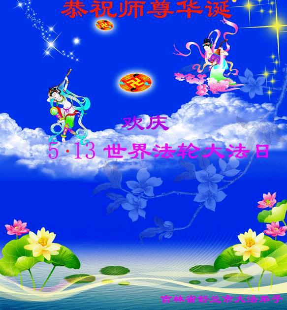 至此五月十三日即将到来之际,我们法轮大法学习小组全体大法弟子恭贺慈悲伟大的师父生日快乐!同时庆贺世界法轮大法日。伟大的师父自一九九二年五月十三日传法以来,为了度成大法弟子及救度宇宙众生历尽艰辛。慈悲伟大师父的伟大胸怀和佛恩浩荡,就是以蓝天为纸、用海水成墨、拿高山作笔都难以尽述。 十几年来,我们从一个满身业力的人,在师父的慈悲呵护下,成为一个成熟的大法弟子,我们对师父的感恩很难用语言表达,我们只有坚信师父、坚信大法,牢记师父的教诲:做好三件事、多救人,完成师父交给的历史使命。再次恭贺慈悲伟大的师父生日快乐! 跪拜,合十! 吉林市昌邑区一学法小组全体大法弟子 二零一三年五月七日 吉林市丰满区大法弟子贺世界法轮大法日!