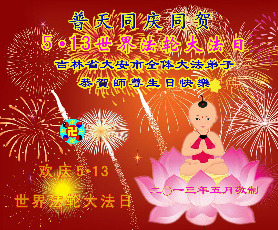 圣日五一三 ,普天同庆同贺。 大法度众生 ,明白真相得度。 吉林省白城市大安市全体大法弟子祝贺世界法轮大法日,并祝师尊生日快乐!