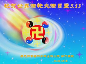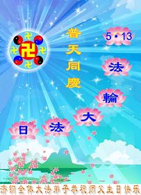 庆祝二零一三法轮大法日! 春风卯辰五一三 世宇垂恩胜似仙 大法开传廿一载 神韵回归正心旋 众生跪拜遥相祝 真相觉醒换新天 慈悲恩师默相助 天福垂巡万万年 法中弟子遵师嘱 三件正念化心田 师父回归中原日 慈悲浩荡感恩篇